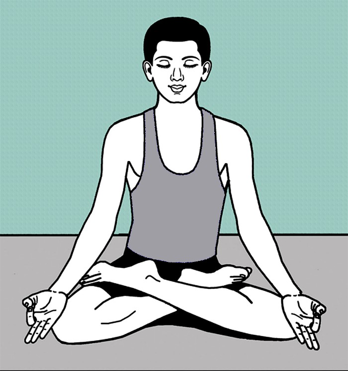 • दोनों पैरों को विपरीत जाँघों पर रखें
